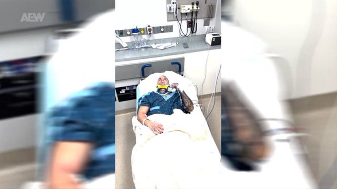 broadcast had him in a hospital bed wearing a neck brace.